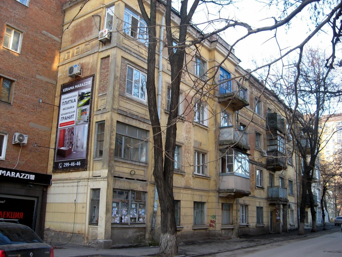 Благодаря интернету, мы получили возможность увидеть, каким был наш город во время войны. Ведь у советских людей фотоаппаратов в то время не было, зато немцы регулярно снимали, захваченные ими места: на память и для отчетности. Много фотографий было сделано ими в Ростове, ведь они здесь были дважды. Большинство найденных снимков Ростова времен оккупации рассмотрено и опознано. Но есть одно неузнанное место на немецком снимке: на первом плане - дот, возле которого стоит немец, на втором плане - двухэтажный дом, похожий на учебное заведение довоенных лет, а дальше виднеется четырехэтажное здание. Оно мне показалось очень знакомым, будто я его где-то видела, где-то рядом, в том же районе, где живу, но никак не могла вспомнить, где именно. Однажды я проходила мимо одного большого дома на улице Текучева, и что-то остановило меня, заставило посмотреть на него внимательно. Я обошла его кругом, заглянула во двор и поняла, что нашла тот дом с немецкой фотографии. Дом состоит из двух зданий: одно П-образное, другое Г-образное в плане. Оба главными фасадами выходят на улицу Текучева, образуя внутри большой двор, а одно из них боковым фасадом располагается по переулку Халтуринскому. Пройдя вдоль него, я поняла, с какого ракурса был сделан снимок. Немецкий фотограф стоял на перекрестке улицы Козлова (прежде – Тринадцатой) и пер. Халтуринского. А двухэтажное здание на первом плане – не что иное, как церковная лавка при церкви Св. Георгия Победоносца, построенной всего два десятка лет назад. Четырехэтажный дом почти не изменился, его силуэт с угловыми открылками и балконами остался прежним, что и позволило его узнать. Во дворе мне повезло встретить старожила дома – Ольгу Павловну 1935 года рождения. Она-то и рассказала мне его историю. Дом был построен для рабочих обувной фабрики им. Микояна в 1932 году и назывался жилищно-строительным кооперативным товариществом «Красный микояновец». Его снимок был напечатан в газете «Молот» в январе того же года. Северо-Кавказская обувная фабрика (СКОФ), открывшаяся в 1926 году, к этому времени приросла новыми корпусами и немалым количеством рабочей силы. Родители Ольги Павловны тоже работали на ней. Дела у обувной фабрики, видимо, шли в гору, раз она могла позволить себе построить два четырехэтажных дома на Новом поселении после того, как в том же 1926 году сразу начала строительство семи двухэтажных восьмиквартирных домов в Рабочем городке для своих рабочих. Однако, несмотря на то, что два дома были довольно большими, построены они были типу общежития, и квартиры в них были, преимущественно, коммунальные, а отопление печное. Во дворе была оборудована детская площадка, посажены деревья, сооружена большая клумба, а вдоль домов разбиты цветники. Детская площадка существует и поныне, только больше нет клумбы, а большая часть двора заставлена машинами. Во время войны дом подвергся некоторым разрушениям, но, все равно, оставался жилым. Однако коммуналки мало пользовались спросом у немцев, да и жильцы не хотели, чтобы те селились в их квартирах. Ольга Павловна рассказывала, что у мамы были больные ноги, и она заставляла домочадцев мочиться в таз, в который опускала ступни, как бы в лечебных целях. По комнате разбрасывали золу, чтобы было грязно. Когда немцы, подыскивая подходящее жилье, заходили к ним, они брезгливо морщились, обзыв