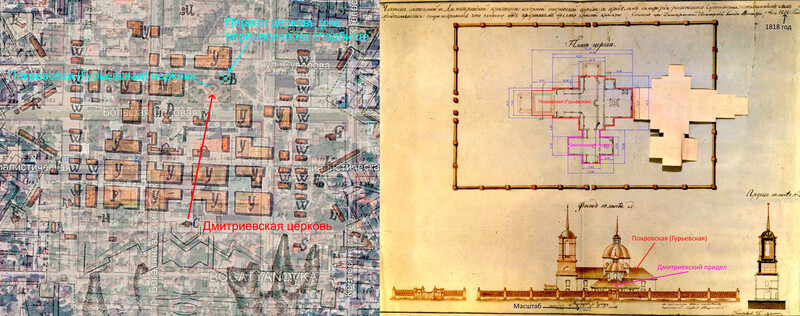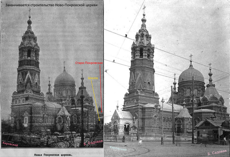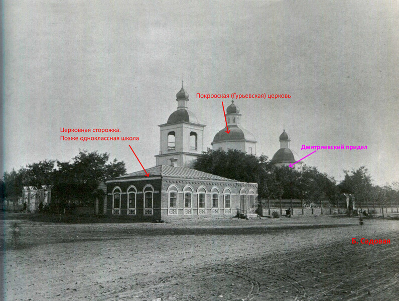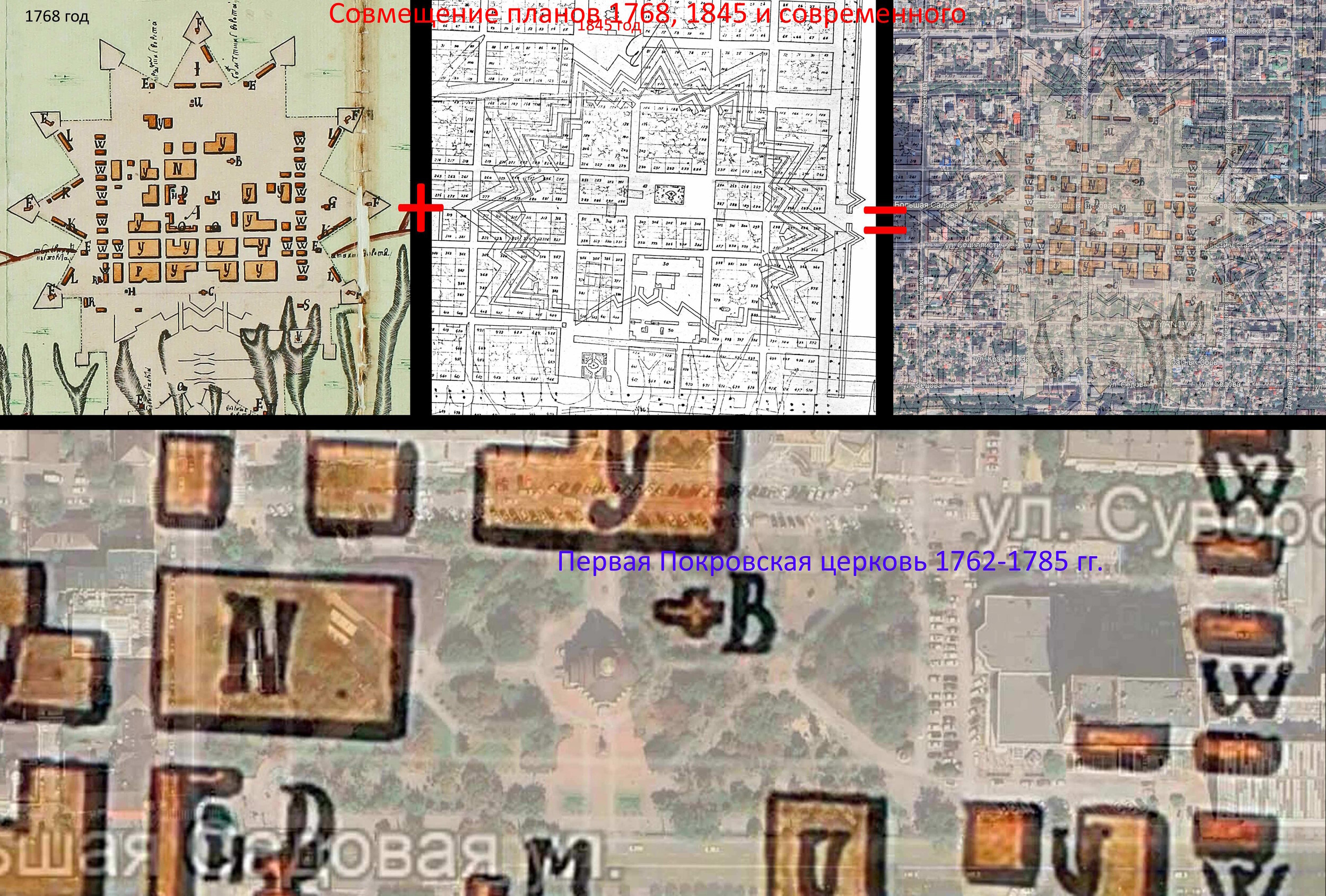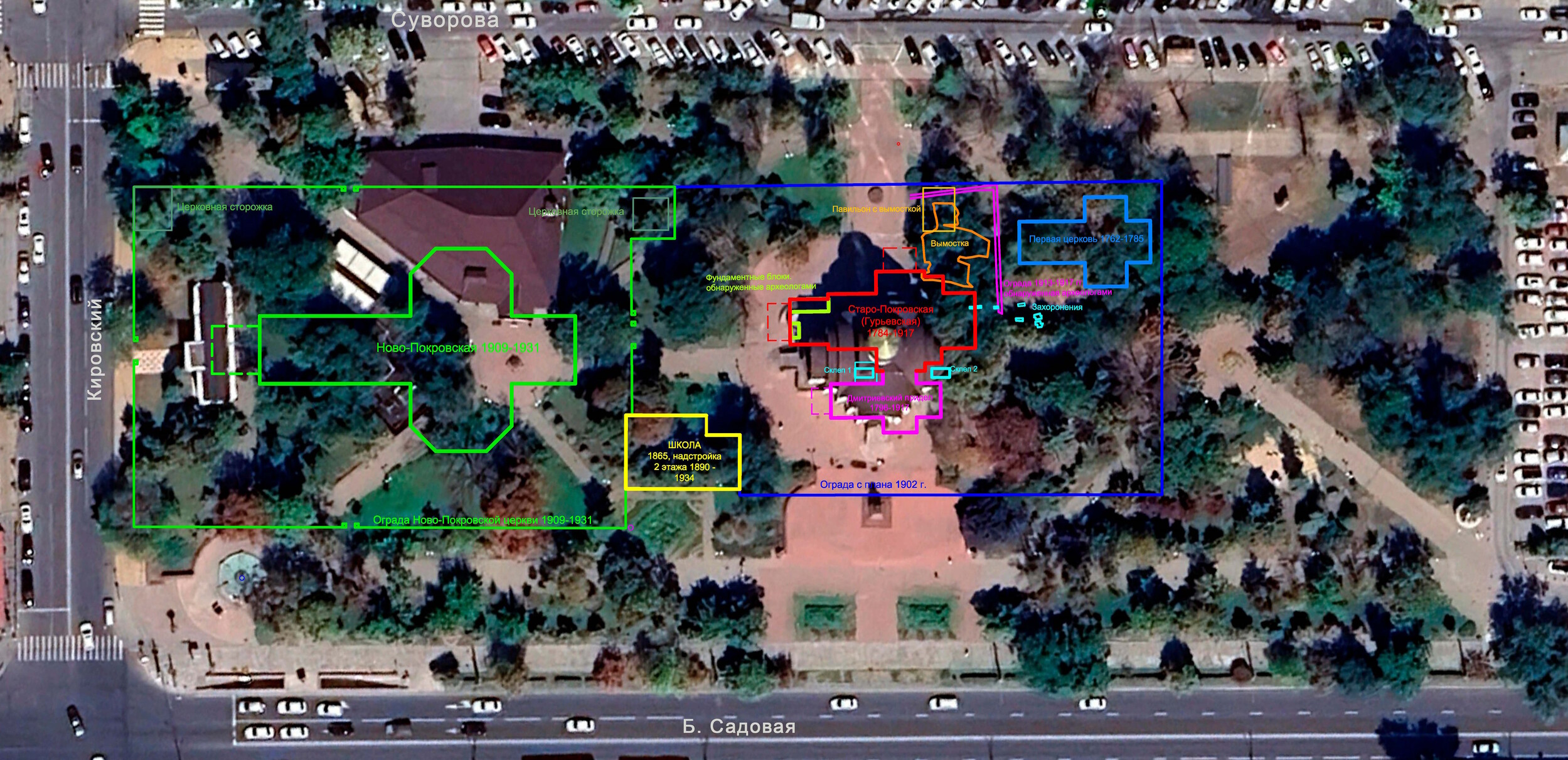 | Вот такое расположение имели исторические строения. И далее подробнее о каждом из них. 1762 год. Вслед за постройкой крепости Св. Дмитрия Ростовского из упраздненной крепости Св. Анны, что под Старочеркасском, сюда была перенесена церковь во имя Покрова Пресвятой Богородицы [1]. 1777 и 1783-84 гг. Полководец А.В. Суворов дважды посещал крепость Дмитрия Ростовского. Историки отмечали, что он был верующим человеком, обязательно посещал церкви [2]. А.В. Суворов идет в Покровскую церковь. Изображение создано при помощи ИИ . 1784 год. Перенесенная церковь обветшала, рядом с ней построили новую, деревянную на каменном фундаменте (ее принято называть Старо-Покровской, либо по фамилии коменданта крепости Гурьева, который выхлопотал ее возведение). Строилась она 2 года с 1782 по 1784 гг. [3] 1785 год. Первую Покровскую церковь разобрали и перенесли на кладбище находившееся на пересечении современных ул. М. Горького и пер. Соборный, освятив ее во имя Всех Святых [4] 1796 год. Из материалов упраздненной церкви Святого Дмитрия, располагавшийся на пересечении современных ул. Петровской и Богатяновского спуска, достроили южный придел Св. Дмитрия Ростовского [5], по сути являющийся отдельной церковью. 1865 год. В юго-западном углу церковного подворья возвели обширную сторожку [6]. Позже в ней разместили одноклассную Покровскую школу [7]. 1881 год. Дмитриевский придел расширили [8]. Его увеличили с западной стороны. 1890 год. На средства доктора Г.И. Ткачева здание одноклассной школы расширили и надстроили второй этаж. В обновленном здании открыли двухклассную школу [9]. 1895 год. Сгорела колокольня [10]. 1909 год. Закончили постройку Новой Покровской церкви. Ее строили с 1897 по 1909 гг. по инициативе и на средства купца Г.Г. Пустовойтова [11]. Покровскую (Гурьевскую) церковь стали называть «Старо-Покровской». 1917 год. Старо-Покровскую церковь вместе с Дмитриевским приделом снесли [12]. Покровский рынок расширился, заняв участок бывшей Старо-Покровской церкви, но при этом сохранили находившиеся рядом с церковью захоронения. 1931-35 год. Ново-Покровскую церковь и здание бывшей школы снесли и устроили сквер [13]. 1939 год. Установили памятник С.М. Кирову и фонтан позади памятника. 2005 год. Памятник Кирову демонтировали и перенесли на пересечение ул. Пушкинской и пр. Кировский. 2007 год. На месте фонтана возвели новую Старо-Покровскую церковь. А на месте памятника Кирову установили памятник императрице Елизавете Петровне. Источники 1. Крещановский Л. Историческая записка Покровской церкви. Стр. 46 2. Лопатин В.С. Суворов, Серия ЖЗЛ, М, Молодая гвардия 3. Крещановский Л. Историческая записка Покровской церкви. Стр. 47 4. Крещановский Л. Историческая записка Покровской церкви. Стр. 17 5. Материалы для историко-статистического описания Екатеринославской епархии. Выпуск 2, 1880 год. Стр. 181. 6. Крещановский Л. Историческая записка Покровской церкви. Стр. 54 7. Крещановский Л. Историческая записка Покровской церкви. Стр. 65 8. Крещановский Л. Историческая записка Покровской церкви. Стр. 81 9. Крещановский Л. Историческая записка Покровской церкви. Стр. 65 10. Крещановский Л. Историческая записка Покровской церкви. Стр. 66 11. Крещановский Л. Историческая записка Покровской церкви. Стр. 68 12. Малаховский Е.И. Храмы и культовые сооружения Ростова-на-Дону, утраченные и существующие. Стр. 60 13. Датировка фотографий на сайте pastvu.com. https://pastvu.com/p/700568, https://p