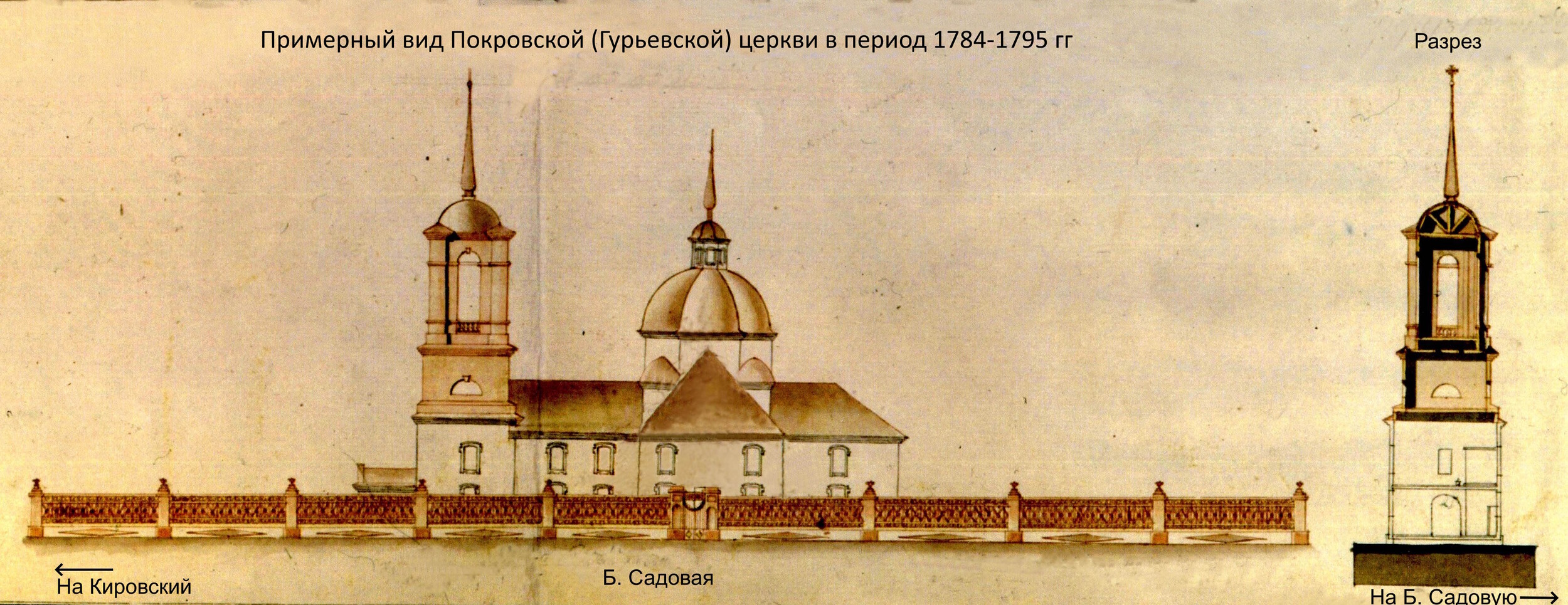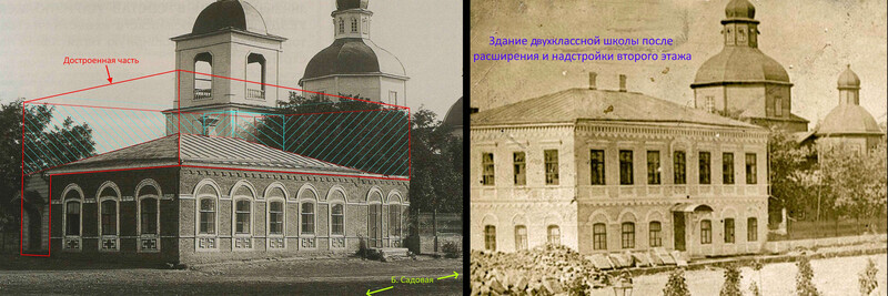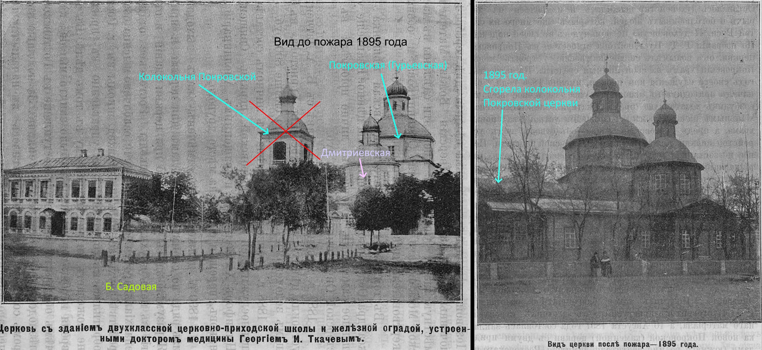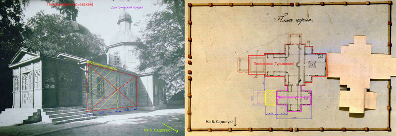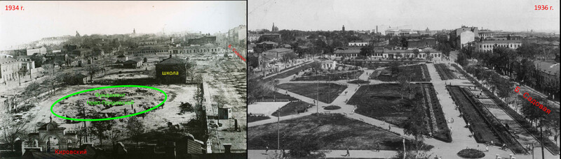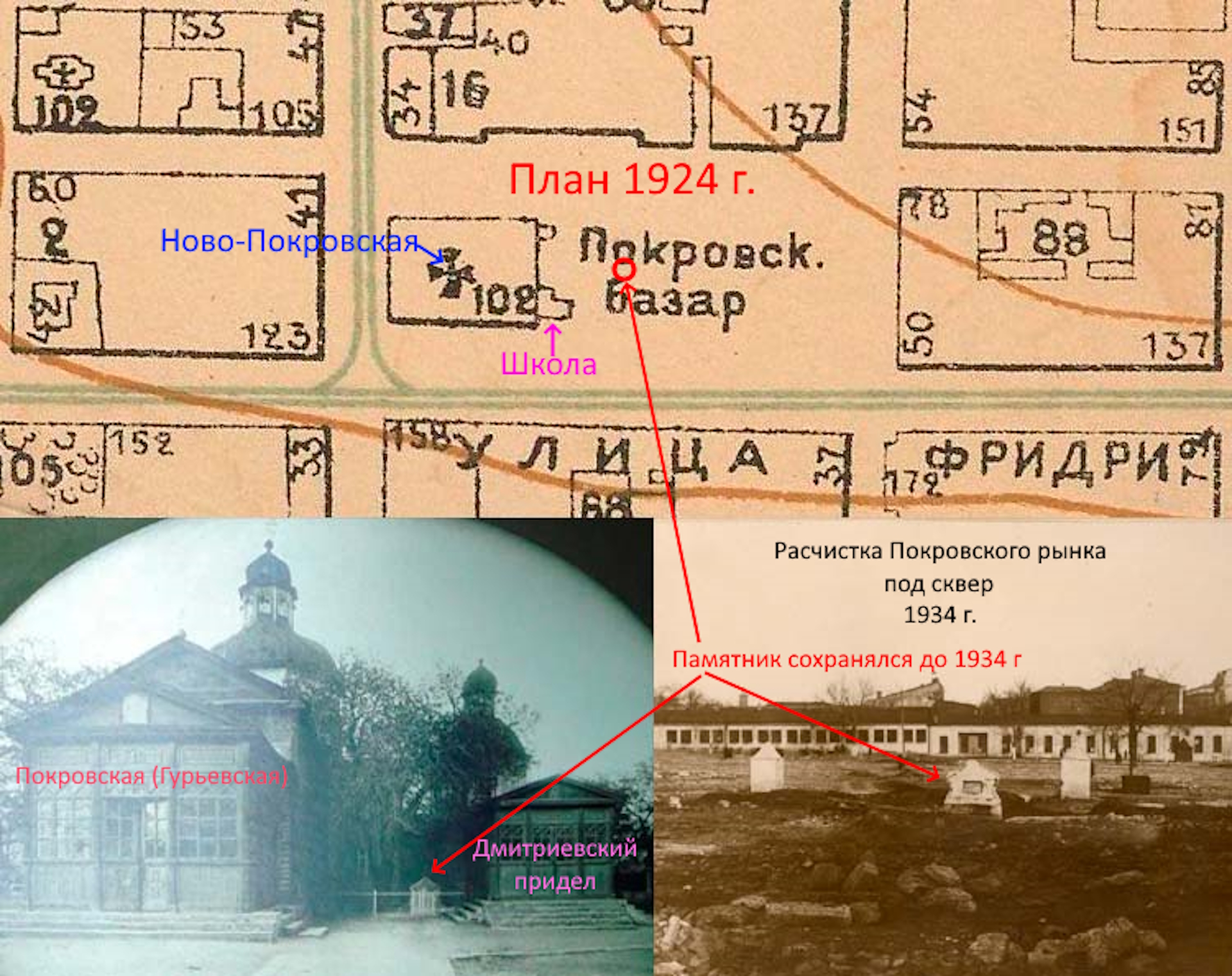 | Вот такое расположение имели исторические строения. И далее подробнее о каждом из них. 1762 год. Вслед за постройкой крепости Св. Дмитрия Ростовского из упраздненной крепости Св. Анны, что под Старочеркасском, сюда была перенесена церковь во имя Покрова Пресвятой Богородицы [1]. 1777 и 1783-84 гг. Полководец А.В. Суворов дважды посещал крепость Дмитрия Ростовского. Историки отмечали, что он был верующим человеком, обязательно посещал церкви [2]. А.В. Суворов идет в Покровскую церковь. Изображение создано при помощи ИИ . 1784 год. Перенесенная церковь обветшала, рядом с ней построили новую, деревянную на каменном фундаменте (ее принято называть Старо-Покровской, либо по фамилии коменданта крепости Гурьева, который выхлопотал ее возведение). Строилась она 2 года с 1782 по 1784 гг. [3] 1785 год. Первую Покровскую церковь разобрали и перенесли на кладбище находившееся на пересечении современных ул. М. Горького и пер. Соборный, освятив ее во имя Всех Святых [4] 1796 год. Из материалов упраздненной церкви Святого Дмитрия, располагавшийся на пересечении современных ул. Петровской и Богатяновского спуска, достроили южный придел Св. Дмитрия Ростовского [5], по сути являющийся отдельной церковью. 1865 год. В юго-западном углу церковного подворья возвели обширную сторожку [6]. Позже в ней разместили одноклассную Покровскую школу [7]. 1881 год. Дмитриевский придел расширили [8]. Его увеличили с западной стороны. 1890 год. На средства доктора Г.И. Ткачева здание одноклассной школы расширили и надстроили второй этаж. В обновленном здании открыли двухклассную школу [9]. 1895 год. Сгорела колокольня [10]. 1909 год. Закончили постройку Новой Покровской церкви. Ее строили с 1897 по 1909 гг. по инициативе и на средства купца Г.Г. Пустовойтова [11]. Покровскую (Гурьевскую) церковь стали называть «Старо-Покровской». 1917 год. Старо-Покровскую церковь вместе с Дмитриевским приделом снесли [12]. Покровский рынок расширился, заняв участок бывшей Старо-Покровской церкви, но при этом сохранили находившиеся рядом с церковью захоронения. 1931-35 год. Ново-Покровскую церковь и здание бывшей школы снесли и устроили сквер [13]. 1939 год. Установили памятник С.М. Кирову и фонтан позади памятника. 2005 год. Памятник Кирову демонтировали и перенесли на пересечение ул. Пушкинской и пр. Кировский. 2007 год. На месте фонтана возвели новую Старо-Покровскую церковь. А на месте памятника Кирову установили памятник императрице Елизавете Петровне. Источники 1. Крещановский Л. Историческая записка Покровской церкви. Стр. 46 2. Лопатин В.С. Суворов, Серия ЖЗЛ, М, Молодая гвардия 3. Крещановский Л. Историческая записка Покровской церкви. Стр. 47 4. Крещановский Л. Историческая записка Покровской церкви. Стр. 17 5. Материалы для историко-статистического описания Екатеринославской епархии. Выпуск 2, 1880 год. Стр. 181. 6. Крещановский Л. Историческая записка Покровской церкви. Стр. 54 7. Крещановский Л. Историческая записка Покровской церкви. Стр. 65 8. Крещановский Л. Историческая записка Покровской церкви. Стр. 81 9. Крещановский Л. Историческая записка Покровской церкви. Стр. 65 10. Крещановский Л. Историческая записка Покровской церкви. Стр. 66 11. Крещановский Л. Историческая записка Покровской церкви. Стр. 68 12. Малаховский Е.И. Храмы и культовые сооружения Ростова-на-Дону, утраченные и существующие. Стр. 60 13. Датировка фотографий на сайте pastvu.com. https://pastvu.com/p/700568, https://p