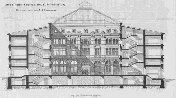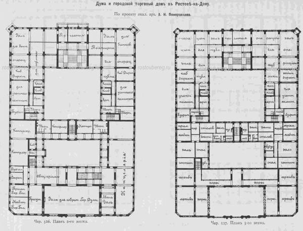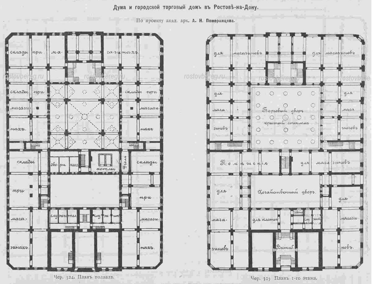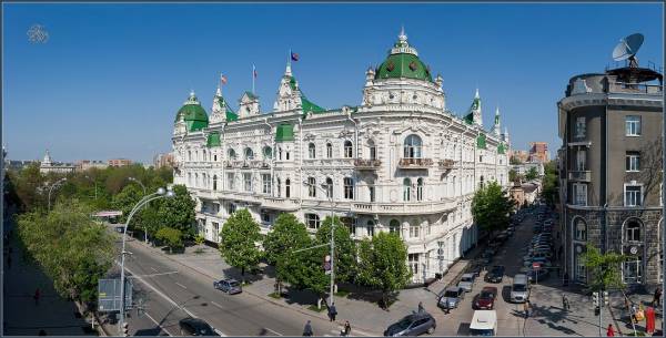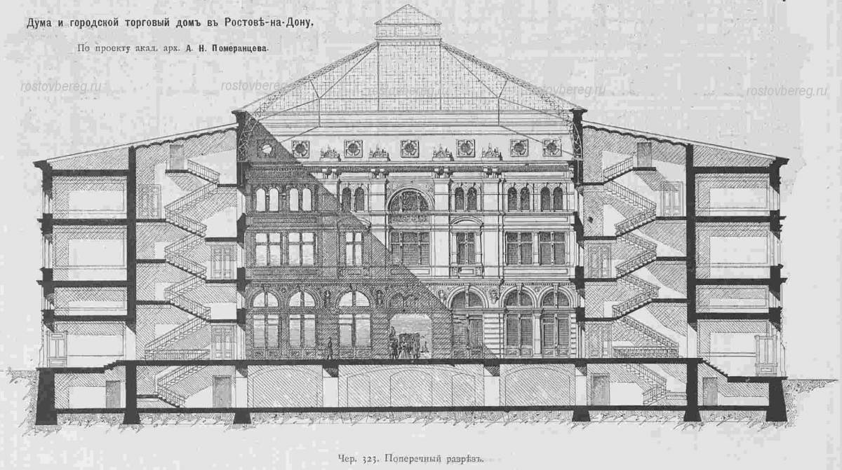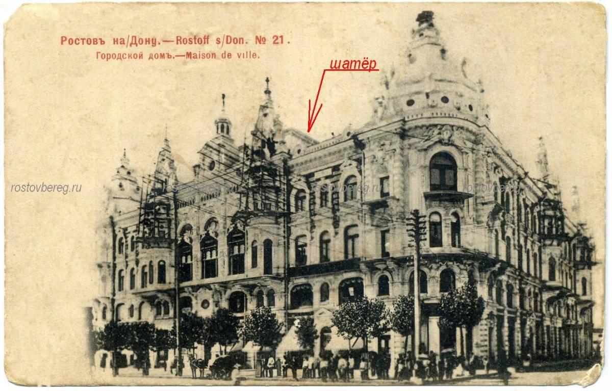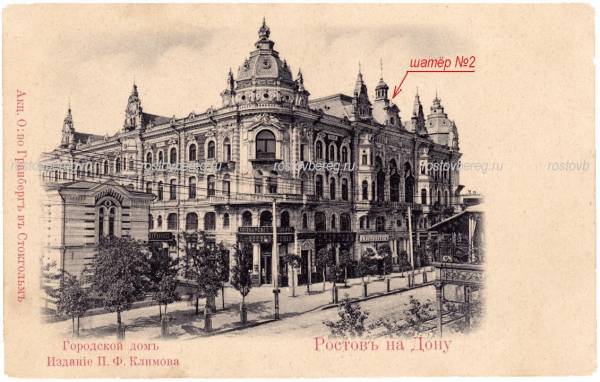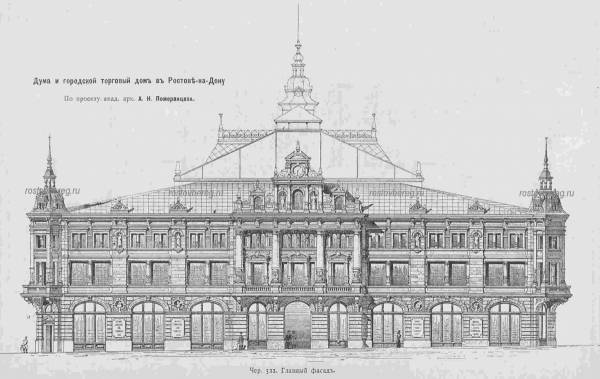 | Увидев благоприятную почву для развития материала, немного переиначил название предыдущей статьи и продолжаю. Относительно недавно здание на Б.Садовой 47 пережило реконструкцию и вроде бы стало вновь историчным. Ему вернули купола, наставили какие-то скульптуры. Первый камешек сомнения в историчности его облика как раз и появился, когда кто-то из группы реставраторов заявил о собственной доработке облика здания – о добавленных скульптурных барышнях, держащих медальоны с гербами города… А только ли в них, этих барышнях заключена разница старого и нового обликов? Каким, вообще его замыслил автор? Давайте «пороем» доступные нам архивы и взглянем на прошлую историю здания, а перед этим ещё раз взглянем на знакомый нам облик дома со всех сторон, в т.ч. и из космоса (вернее из «Гугла»). Вот он сегодняшний. Как говорится «анфас» (уже не вспомню чья это фоторабота и откуда её прибрал, но работа эта очень хороша, согласитесь), и «профиль» А теперь в историю. В первой части повествования рассказывалось не то о плагиате знаменитого и именитого архитектора Померанцева, не то о его авантюризме, позволившем подсунуть ростовчанам уже проданный ранее другому городу проект, не то, наоборот, об его прозорливости и продаже на этом основании Ростову проекта дома, ранее уже построенного, т.е. с исправленными недочётами, а значит, добротного... Я и сам не решил, как понимать обнаруженный тогда материал, но вот новые находки и его продолжение, всё более и более непонятное: В прессе старого времени, ещё накануне его постройки (1897 год) обнаружился следующий материал: «Долго тянувшийся вопрос о постройке городского дома на Театральной площади, наконец решён: проект этого здания, составленный проф. А.Померанцевым, окончательно принят городским управлением. Общая стоимость проектированного здания определена в 513.627 руб. Что касается вопроса об источниках, из которых может быть покрыт такой экстраординарный расход, то финансовая комиссия остановилась на мысли произвести заём. Что касается способа ведения работ, то комиссия нашла более удобным производить таковые смешанным, подрядно-хозяйственным способом – способом каким велись работы по постройке здания женской гимназии, и для этого образовать особую исполнительную комиссию, выбор которой предоставить городской Думе нового состава, имеющего быть образованным к маю 1897 года. Но ещё до образования такой комиссии, теперь же предполагается приступить к подготовительным распоряжениям по закупке материалов, производству торгов на отдельные работы и заготовки и т.п.; самые же работы решено начать ранней весной будущего года». Вдумаемся, раз в 1897 г. уже принимаются такие решения, значит проект ПОЛНОСТЬЮ согласован и утверждён. И вот дальше, уже из следующего года: «Ростов на Дону. Здание Думы и городского торгового дома, представленное на чертежах 322-327 (технический журнал с чертежами и схемами), проект которого составлен и представляет одно из грандиозных зданий города Ростова, к слову сказать, весьма быстро растущего за последнее десятилетие. Здание думы занимает громадную площадь, открытую со всех сторон. Первый этаж нового здания предназначается для торговых помещений, товарного двора, крытого стеклом. Во втором и третьем этажах будут помещаться два городских учреждения: банк и городская дума с кварти