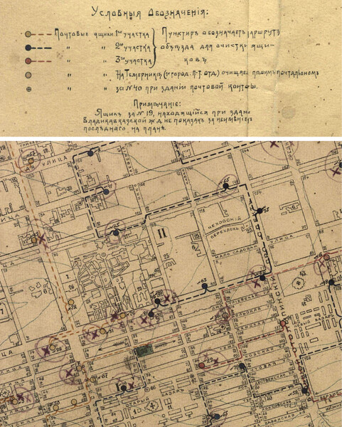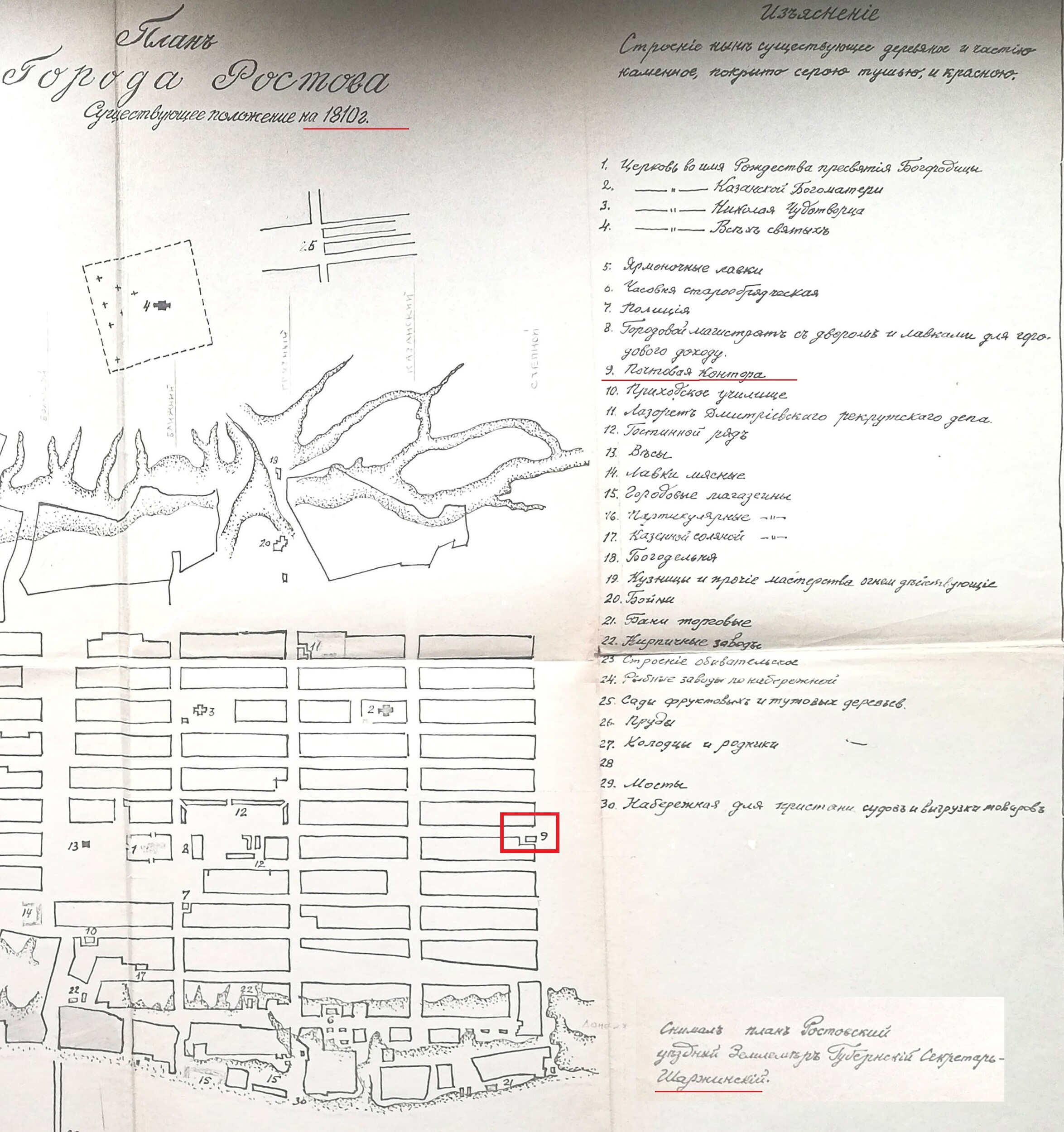 «Кто стучится в дверь ко мне? С толстой сумкой на ремне??? Это он, это он! Наш ростовский почтальон!» Сегодня наши почтовые ящики предназначены больше не для почты, а для квитанций по квартплате, да забрасывания нас рекламой…. А 6 сентября 1901 года ростовчанин, проживавший на Темерницкой улице в доме 110 владельца Фёдора Маликова, Неронов Михаил, получил поздравительную телеграмму, откуда бы Вы, уважаемый Читатель, думали? С чем его поздравляли, не знаю, но бланк телеграммы, с адресами отправителя и получателя, да и самим текстом, заполнен на немецком языке. Удивительно, но отправлена она была из города, … Нахичевани на Дону. "Мои сердечные поздравления. Рыбачок". Вот и весь текст. На краях бланка сохранились две половинки пломбирующей марки. То есть, телеграмма была ещё и опечатана от посторонних глаз.Но, конечно, что удивляет больше всего - города отправления и получения сообщения, это два города, связанных между собой трамвайной линией, извозчиками, наконец, не таких уж далёких друг от друга даже для пешей прогулки, но поздравление телеграммой?!!! Вывод единственный – так было дешевле и быстрее. Доставлена она была в 8.15 утра. Вот как работала почта 124 года назад! Люди вполне могли ей доверять. Кстати, письма, которые мы сегодня называем заказными, тоже имели свою гарантийную оклеивающую марку. В Ростове вот такую: Почта в Ростове, а судя по имеющимся данным, и во всей Российской Империи, работала стабильно. Что говорить? – Госпредприятие! Часть материалов, которые будут собраны в эту статью, на разных страницах «Ростовберега» уже была представлялась, но думаю, кое что не грех и вспомнить. Итак, ещё на самом первом городском плане Ростова, даже ещё не утвержденном императором в 1811 году, а на прорисовке города местным техником Шаржинским, мы видим фактическое место первой ростовской почтовой конторы – на углу современных Ворошиловского и ул. Станиславского. Не зря же в старое время улица Станиславского называлась Почтовой. Располагалась контора на окраине тогдашнего города. Вероятно, что бы не заставлять почтовые экипажи петлять по городским кварталам. А потом, к 1860-м, почту всё же переместили. Её новым местом стало место сегодняшнего Педагогического Университета. И улица Почтовая стала называться Старо-Почтовой, а бывший Первый переулок стал Почтовым. Наконец, в середине 1890-х поста заняла новое место на Соборном переулке, который уже в честь этого учреждения не переназывали. Интересны следы старых почт: Сегодня на Ворошиловском стоит довольно симпатичный и даже солидный дом, около 1896 года постройки, и прошу обратить внимание на его несимметричность. Он был бы симметричным, будь продолжен до угла с бывшей Почтовой. Вероятно, так его строитель, г-н Котляров, и планировал поступить, тем более это место уже принадлежало ему, но дом ему достроить было не дано. А на самом углу даже в конце 19 и начале 20-го веков всё щё стояли постройки старой почты. К сожалению, мне не известно ни одной фотографии этого места старых лет. Но есть чертёж, снятый с почтового подворья в 1839-м году. Я не стану его выкладывать полным (документ огромен по мегабайтам), а лишь покажу фасад подворья по северной стороне, по Почтовой улице. А всё подворье было огромно, около 40 х 20 саженей – более 84 х 42 метров. Не меньшим было и подворье почты на Большой Садовой. Но при всём этом само з