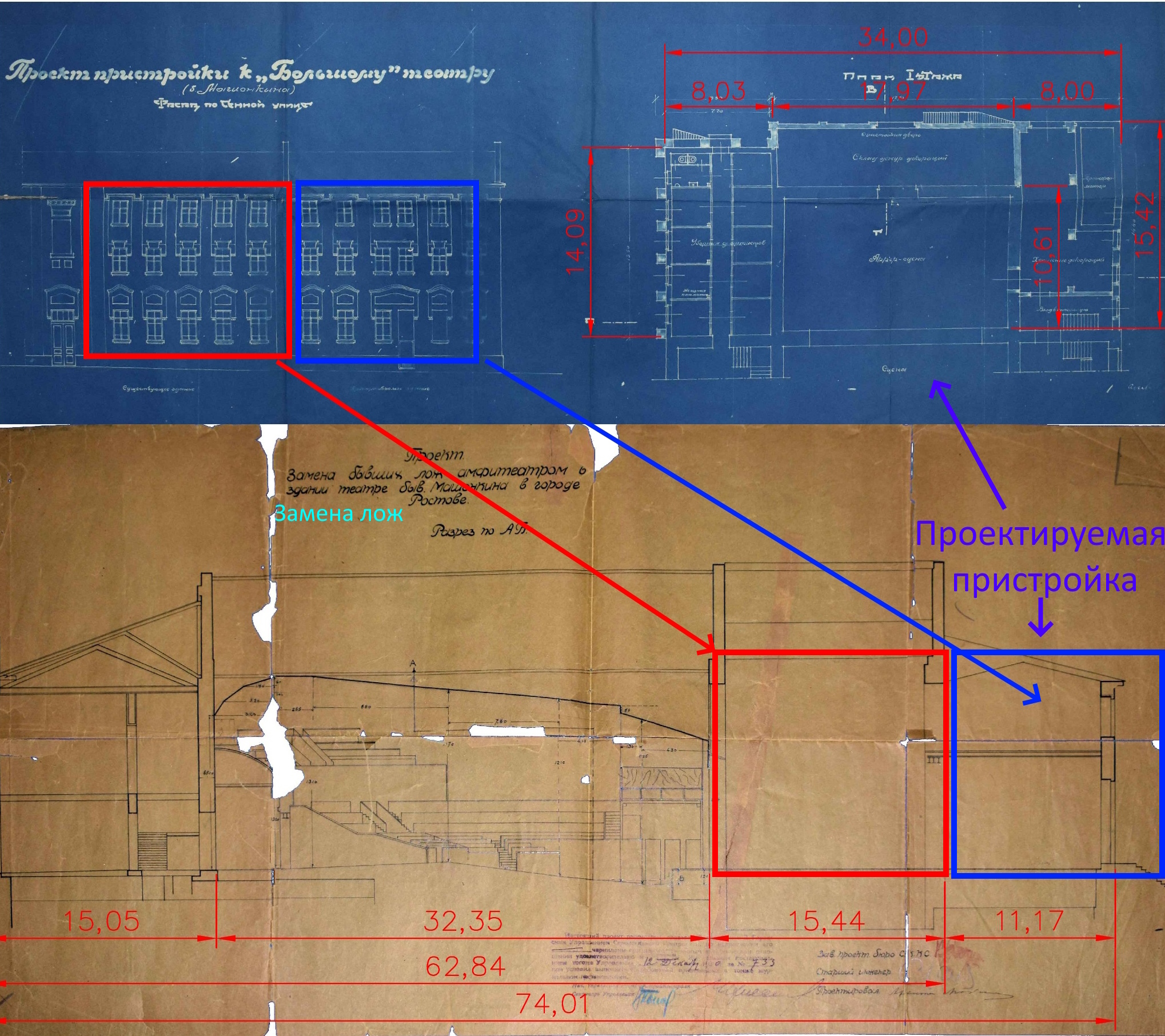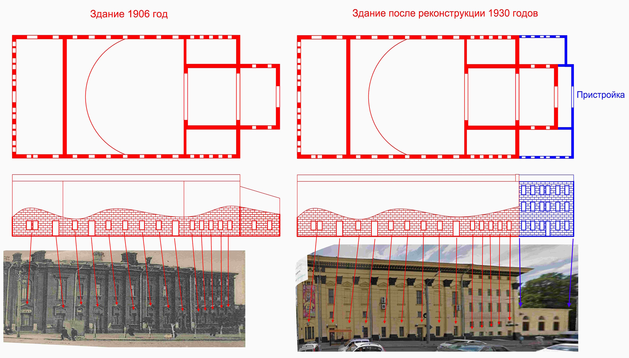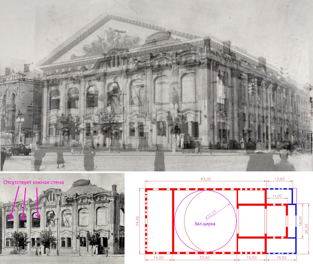 Здание современного цирка было построено в 1957 году. А точнее ПЕРЕстроено из разрушенного войной тетра Машонкина. История этого театра хорошо освещена в статье «Большой Буфф Машонкиных». Театр-цирк Машонкина был построен в 1906 году. Я попытался восстановить его примерный план, отталкиваясь от плана и продольного разреза 1930-х годов, созданных при реконструкции театра (Рис. 1). Контуры изначального здания хорошо просматривается на аэрофотосъемке 1943 года (рис 2), на которой у здания нет крыши и остались лишь стены. Здание имело холл, зрительный зал с ложами (позже амфитеатром), сценическую коробку, по бокам от которой располагались гримёрки, а завершала здание двухэтажная пристройка арьерсцены. Ее хорошо видно на фото, сделанном из сада Буфф (рис 3). Кроме этого на аэрофотосъемке хорошо видна та самая пристройка, сделанная в 1930-х годах. Планы не очень корректно отсканированы, имеют искажения, поэтому размеры на них пляшут. Я не стал добиваться большой точности построения планов, поэтому размеры попытался усреднить. Так же не стал наносить лестницы и перегородки, ограничившись только несущими стенами. В 1930-х годах ложи театра заменили амфитеатром (об этом есть подпись на продольном разрезе) а вокруг арьерсцены возвели пристройку. Для ее проектирования и создавались используемые мной планы на рис. 1. На рис. 4 я сделал пояснения что именно добавилось. Сравнивая боковой фасад театра с боковым фасадом цирка становится понятно, что здание осталось в прежних габаритах, пристройка 1930 годов стала не трёхэтажной, а двух, а бывшая пристройка арьерсцены машонкинского театра возвышается над пристройкой, сделанной в 30-х годах (рис. 5). Хотя есть нюанс. Пристройку могли сделать не трехэтажной, как было запроектировано, а двух. И на аэрофотосъемке вроде бы видно только двухэтажную. Но она могла быть разрушена, а могла быть и не построена. Если быть совсем точным, то здание увеличилось по высоте (его надстроили), на главном фасаде по Будёновскому изменили конфигурацию оконных проемов. А вот южную стену скорее всего поднимали от самой земли, поскольку она была полностью разрушена. На рис. 6 в окна на фасаде видны соседние строения, что говорит о том, что южная стена отсутствует. Возможно она отсутствовала не полностью, а какая-то ее часть. Но ширина здания осталась прежней, стену если и подняли с нуля, то использовали старый фундамент. ![]() Источники: Интернет, сайт pastvu.com, сайт goskatalog.ru, архив А. Овчинникова | |